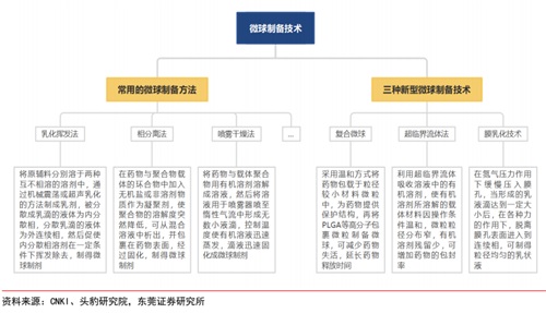從技術上看,微球的制備技術較多,但并無絕對優勢技術,需要根據藥物的理化性質決定適合的制備方法。不同藥物適用的微球制備技術不一,各種參數調試過程繁雜。即便是同一方法,用于制備不同結構的微球時,其制備參數、結構形成原理也會有所差別,如溶劑揮發法。因此,微球制劑較難實現產業化線性放大。常用的微球制備方法包括乳化揮發法、相分離法、噴霧干燥法、鹽析固化法等。目前,較新穎的微球制備技術包括復合微球、超臨界流體法、膜乳化技術等。