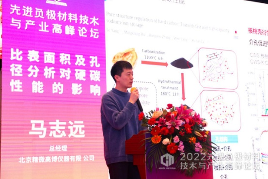 北京精微高博儀器有限公司馬志遠(yuǎn)總經(jīng)理(牛宇鑫 代)作《比表面積及孔徑分析對(duì)硬碳性能的影響》報(bào)告