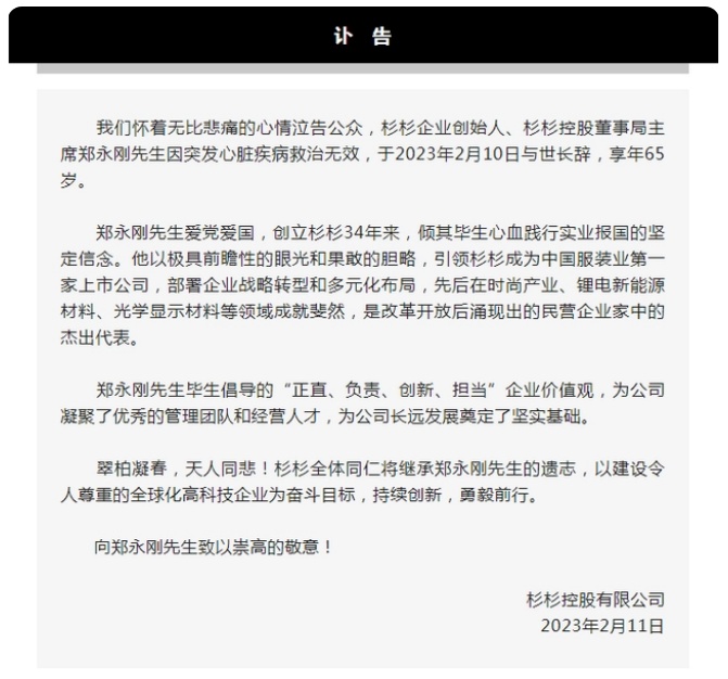 中國粉體網訊 2月11日,杉杉控股有限公司的微信公眾號發布訃告,杉杉企業創始人、杉杉控股董事局主席鄭永剛因突發心臟疾病救治無效,于2023年2月10日去世,享年65歲。