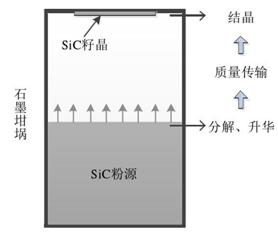 目前生長SiC單晶的方法主要有物理氣相傳輸法、高溫化學氣相沉積法、液相法等。其中物理氣相傳輸法是發展最成熟的,其具體生長過程為處于高溫處的SiC原料升華分解成氣相物質(主要組分為Si,Si2C,SiC2),這些氣相物質輸運到溫度較低的籽晶處,結晶生成SiC單晶。