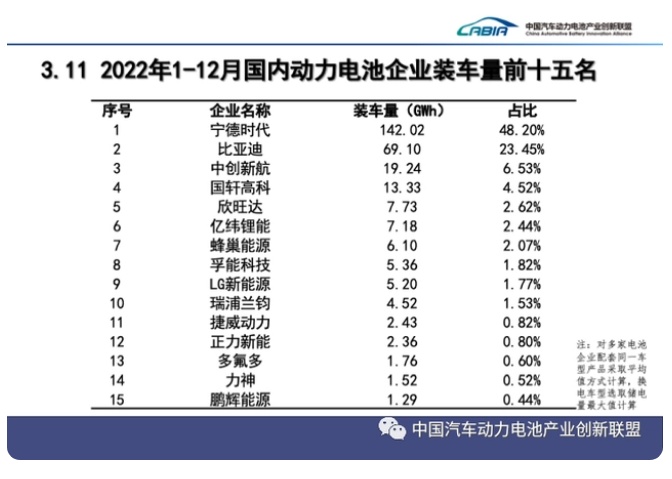 與2021年相比,2022年寧德時(shí)代、國(guó)軒高科市占率均有所減少。其中,寧德時(shí)代減少了3.90個(gè)百分點(diǎn);國(guó)軒高科減少了0.68個(gè)百分點(diǎn)。同時(shí),比亞迪、中創(chuàng)新航市占率有所提升。其中,與2021年相比,比亞迪2022年市占率更是提升了7.25個(gè)百分點(diǎn)。