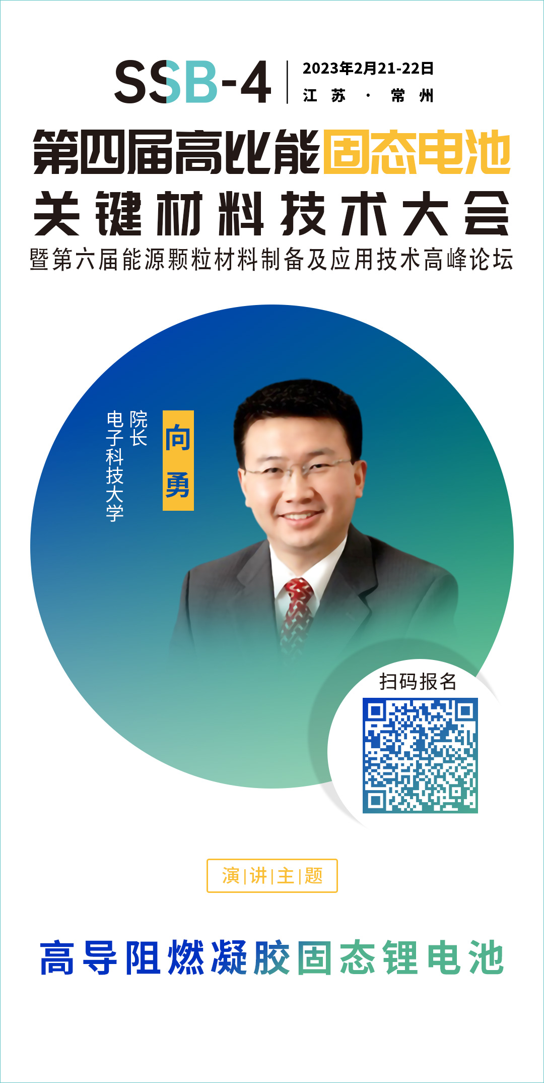 針對固態(tài)電池相關(guān)的技術(shù)、材料、市場及產(chǎn)業(yè)等方面的問題,中國粉體網(wǎng)將于2023年2月21-22日在常州舉辦第四屆高比能固態(tài)電池關(guān)鍵材料技術(shù)大會。為致力于固態(tài)電池技術(shù)開發(fā)的企業(yè),科研院校,以及電動車、儲能、特種應(yīng)用等終端企業(yè)提供信息交流的平臺,開展產(chǎn)、學(xué)、研合作,共同推動行業(yè)發(fā)展。屆時,電子科技大學(xué)向勇教授將作題為《高導(dǎo)阻燃凝膠固態(tài)鋰電池》的報告。報告重點(diǎn)介紹隔膜表界面的固態(tài)電解質(zhì)共形修飾技術(shù),具有高溫和強(qiáng)氧化/還原界面智能響應(yīng)功能的小分子添加劑,高效阻燃劑微膠囊包覆技術(shù),以及凝膠原位固化工藝等。