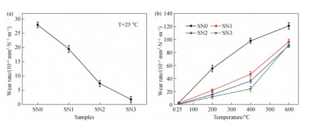 引入Ag對氮化硅陶瓷室溫(a)和高溫(b)磨損率的影響,SN0-SN3分別是代表Ag的引入量