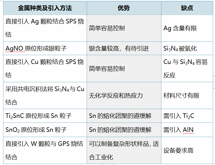 大多數方法是以SPS燒結工藝為主,結合金屬前驅體引入Si3N4陶瓷。優點在于避免低熔點金屬團聚,有效實現致密化;缺點在于不能解決熱膨脹不匹配以及界面反應問題,材料產業化受到限制。