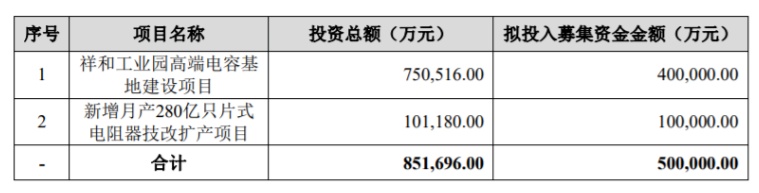 為提升MLCC產能規模及優化產品結構,投資75.05億元用于建設祥和工業園高端電容基地項目,項目建設期28個月,達產后,新增月產450億只高端MLCC,預計年新增營業收入約為49億元;擬募集資金50億元,用于“祥和工業園高端電容基地建設項目”以及“新增月產280億只片式電阻器技改擴產項目”。該項目是為加快拓展高端通訊、汽車電子、5G等市場目標。