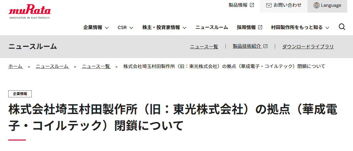 根據(jù)公告顯示的信息,村田已經(jīng)在今年1月31日關閉了其在中國臺灣的海外子公司華成電子股份有限公司,并且將于4月30日關閉位于日本的子公司COILTEC。