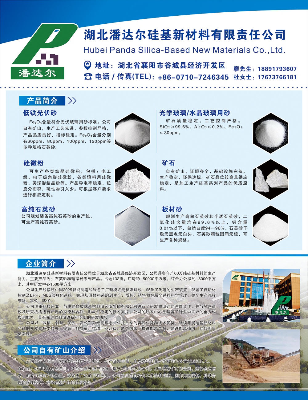 湖北潘達爾硅基新材料有限責任公司位于湖北省谷城縣經濟開發區,公司具備年產60萬噸硅基材料的生產能力,主要產品為:石英砂和硅微粉系列產品。