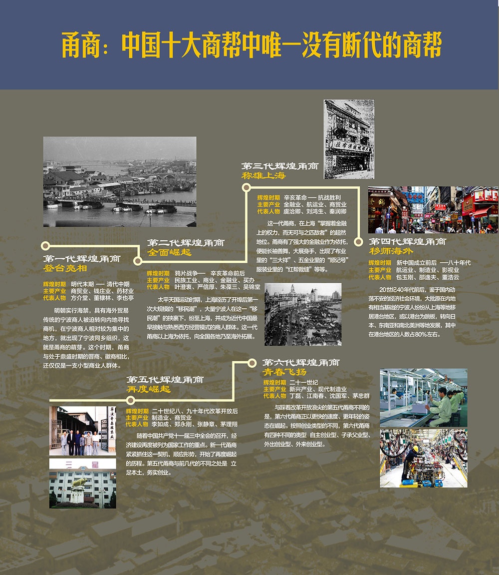 甬,浙江省寧波市的簡稱,因境內有甬江而得名。甬商則是指寧波籍經商的人。中國十大商幫中唯一沒有斷代的就是甬商。