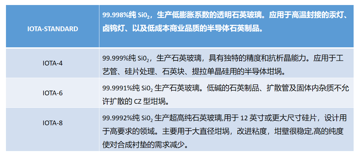 在光源領域,公司主要產品有特種光源用石英管、棒,汽車燈光源用石英管、棒,紅外光源用石英管;在光纖領域,公司產品有光纖級套管、光纖級爐芯管、光纖級石英管、光纖級石英棒;在半導體領域,主要產品有半導體級石英管、半導體級石英棒、半導體級石英筒、半導體級石英錠、半導體級石英板、石英陶瓷圓坩堝、半導體級石英砂;在光學領域,主要產品有紫外光學用合成石英材料、標準光學用石英材料、紅外光學用石英材料;在光伏領域,主要產品有太陽能級石英管、太陽能級石英棒、太陽能級乳白石英錠、太陽能級石英砂等。