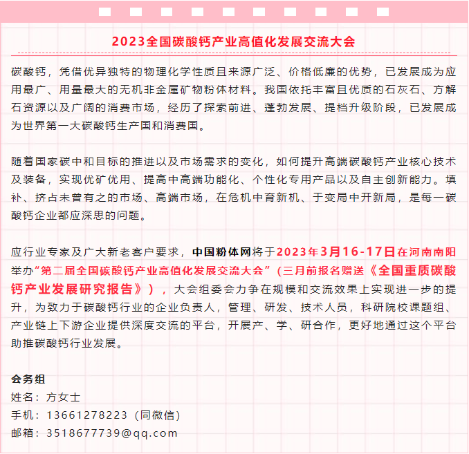 “第二屆全國碳酸鈣產(chǎn)業(yè)高值化發(fā)展交流大會”將于2023年3月16-17日在河南南陽舉辦。圍繞“精細(xì)加工,高值應(yīng)用”主題,本次會議將匯聚碳酸鈣產(chǎn)業(yè)鏈上下游企業(yè)、專家學(xué)者,共同探討業(yè)內(nèi)設(shè)備工藝新進(jìn)展以及造紙、涂料、塑料、橡膠等應(yīng)用行業(yè)的新動態(tài)新導(dǎo)向。東莞澳達(dá)環(huán)保新材料有限公司將出席本次會議,邀您一同參會。