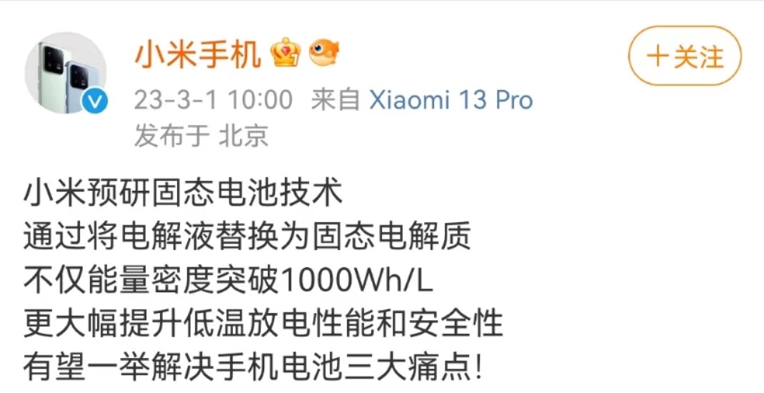 中國粉體網訊 3月1日上午,小米手機發布了一條動態,宣布小米預研固態電池技術,目前在實驗室中已經取得階段性成果,未來可帶來固態電池技術的三大提升,即能量密度突破 1000Wh/L、低溫下放電性能提升 20%、針刺實驗通過率大幅提升。