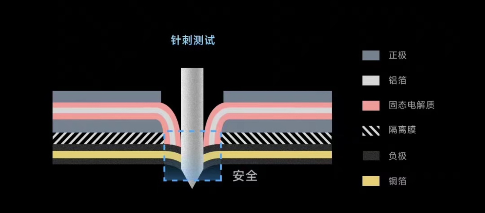 一直以來,針刺實驗都是傳統非固態電池的痛點,實驗中短路和起火燃燒的概率極大,這是由于針刺造成了正極集流體鋁箔和負極活性材料接觸導致短路。而小米通過在正極底涂固態電解質陶瓷的方式,提高了其針刺實驗的通過率,其安全可靠性也得到提高。