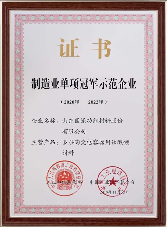 2019年,國瓷材料憑借“多層陶瓷電容器用鈦酸鋇材料”入選國家級單項冠軍示范企業(第四批)。制造業單項冠軍企業,是指長期專注制造業某一特定細分產品市場,生產技術或工藝國際領先,具有強大的市場競爭力,單項產品市場占有率位居全球前列的企業。制造業單項冠軍企業作為優質制造業企業培育體系中的重要一環,突出表現在專注目標市場、長期在特定細分領域“精耕細作”,創新投入、創新能力、管理水平、經營效益等方面處于行業引領地位。