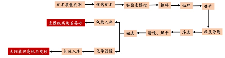 依據科學的判別方法,給自家的石英原料做個等級劃分,十分有利于正確認識自家石英礦的價值及后續的高效開發利用。石英提純工藝流程應該是基于石英原料的工藝礦物學研究和可選性試驗結果而設計制定的。具體的提純工藝應視石英原料品質而定。