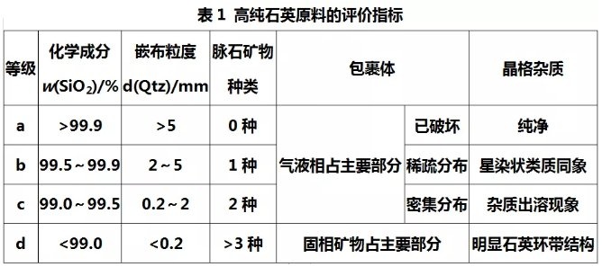 為了解決高純石英砂原料的選擇和評價問題,孫紅娟教授課題組提出了一套科學可行的評價方法,具體涉及到化學成分、嵌布粒度、脈石礦物、包裹體和晶格雜質這個5個關鍵評價指標,當石英原料在以上5個關鍵評價指標中有3個及以上指標達到a級時(表1),可以推薦為高純石英原料。