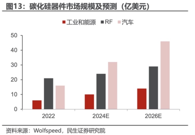 據碳化硅行業全球龍頭廠商Wolfspeed的數據和預測,汽車領域碳化硅器件市場規模明顯更高,但工業能源領域、射頻領域的高增長亦不容忽視。
