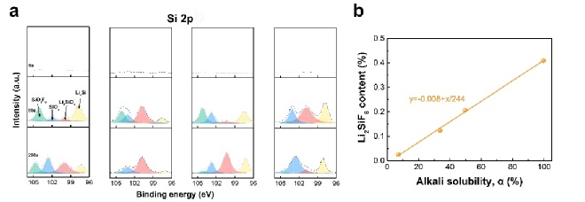 圖4.活性物質(zhì)損失分析。a)電極表面SEI高分辨率Si2pXPS光譜(堿溶度從左到右減小);b)100次循環(huán)后堿溶度與SEI中Li2SiF6含量關(guān)系。