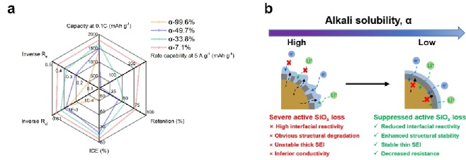 圖5.關(guān)鍵性能比較和包覆完整度對界面副反應(yīng)抑制機理示意。a)不同堿溶度復(fù)合物負極材料關(guān)鍵性能指標雷達圖;b)包覆完整度對于改善界面失效作用機制示意圖。