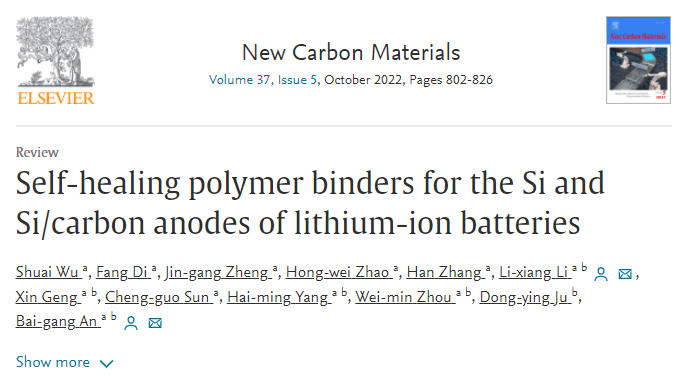 近日,遼寧科技大學安百鋼教授課題組在《新型炭材料(中英文)》(New Carbon Materials)上發表綜述文章“Self-healing polymer binders for the Si and Si/carbon anodes of lithium-ionbatteries”。文章總結歸納了基于非共價鍵和可逆共價鍵交聯及自組裝具有自修復性質的聚合物黏合劑的合成、表征及在Si(/C)負極的應用與自修復機制。分析了碳質納米材料與自修復聚合物復合涂層對于緩沖Si負極體積膨脹應力并有效維持電極結構穩定性的重要作用。簡要總結了自修復聚合物在柔性鋰電池固態電解質中的最新應用。最后,對應用于Si(/C)負極自修復聚合物黏合劑面臨的技術挑戰和設計策略進行了分析和展望。