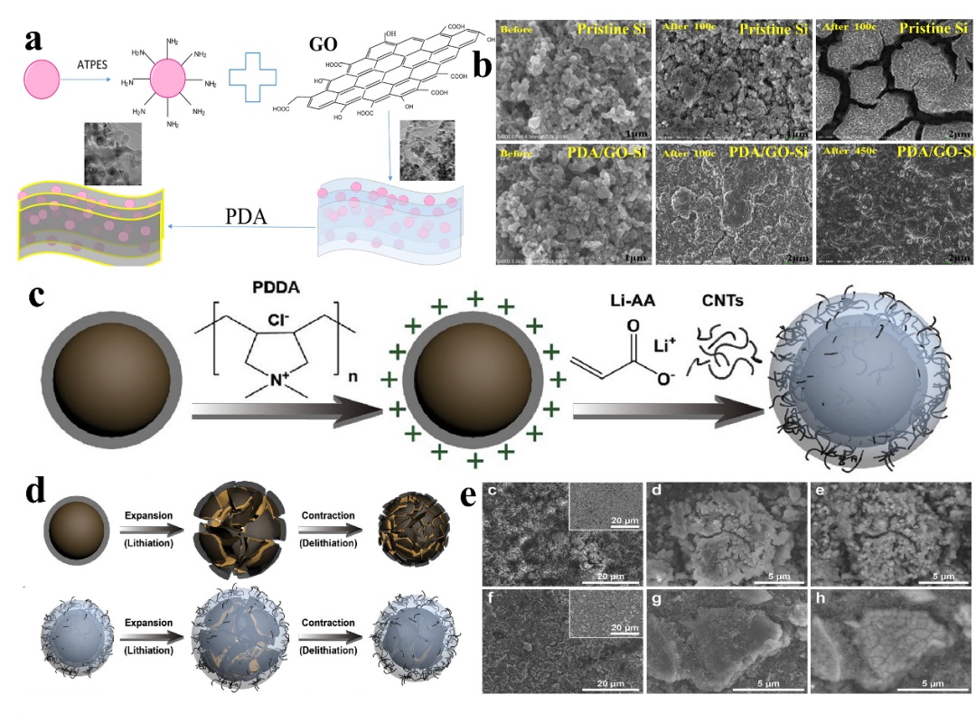 硅具有高的理論儲鋰容量(3579mAhg-1),使其成為高比容量鋰離子電池倍具希望的負極材料。然而,低電導率、嚴重的體積效應和不穩定的固體電解質界面(SEI)等問題限制了Si負極在鋰離子電池中的應用。近年來,在電極材料設計和電池體系兩個方面已報道了許多有效策略來應對上述挑戰,例如活性顆粒納米化、表面包覆、合金化材料、構筑核殼結構、構建硅碳(Si/C)復合結構以及預鋰化、使用電解液添加劑和功能性黏合劑等(圖1)。