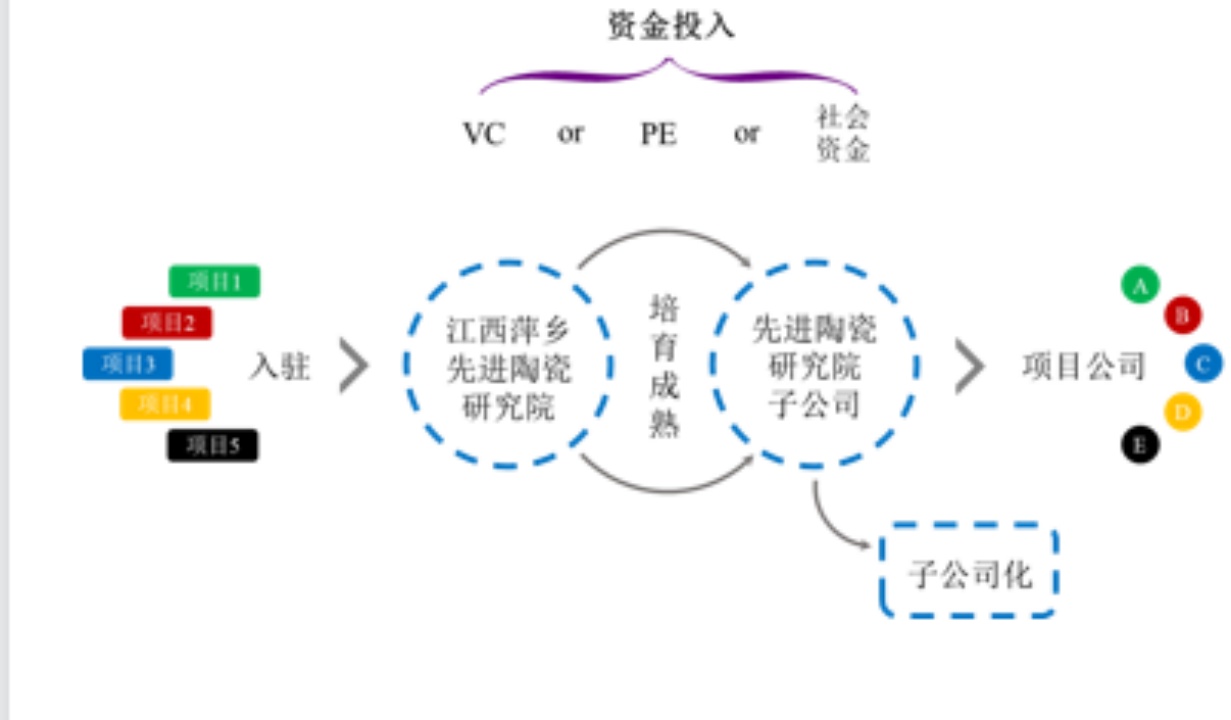 研究院采用“1+1+X”產業化運營模式,即研究院、實體公司和項目公司三位一體的三方融合共贏。研究院每年將投入3000萬元以上的孵化資金,遴選開展10項左右先進陶瓷領域的新技術項目孵化和2-3項成果產業化。