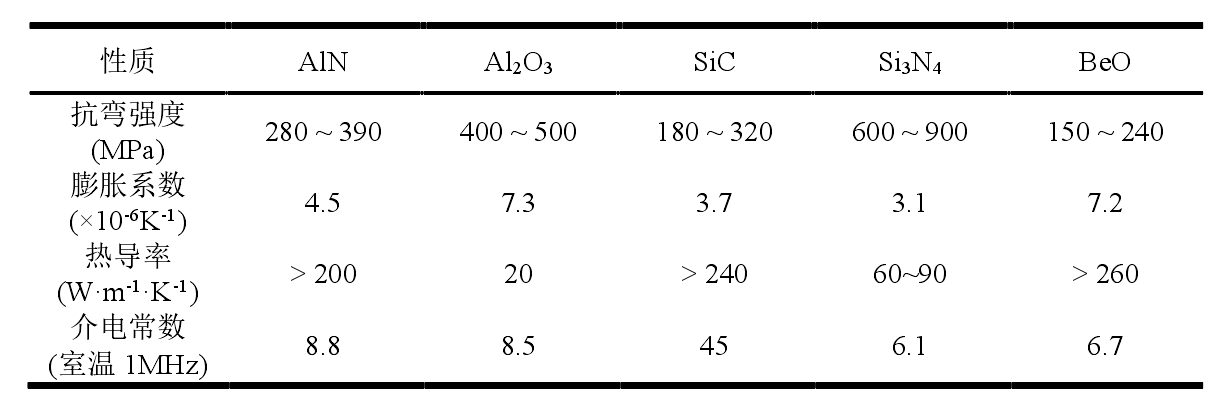 近年來已經大規模生產、應用較為廣泛的陶瓷基板主要有:Al2O3、BeO、SiC、Si3N4、AlN等。其中氮化硅是國內外公認兼具高導熱、高可靠性等綜合性能最好的陶瓷基板材料。盡管Si3N4陶瓷基板具有略低于AlN的導熱性,但其抗彎強度、斷裂韌性都可達到AlN的2倍以上;同時,Si3N4陶瓷的熱導率遠大于Al2O3陶瓷;此外,Si3N4陶瓷基板的熱膨脹系數與第3代半導體襯底SiC晶體接近,使其能夠與SiC晶體材料匹配性更穩定。這使Si3N4成為第3代SiC半導體功率器件高導熱基板材料的首選。