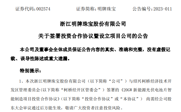 中國粉體網訊 3月12日,明牌珠寶(002574)發布公告,公司與柯橋經開區管委會為加快推進區域經濟高質量發展,雙方本著互惠互利、共謀發展的原則,就公司投資建設 20GW 新能源光伏電池片智能制造項目的相關事宜,簽署了《20GW 新能源光伏電池片智能制造項目投資合作協議》。