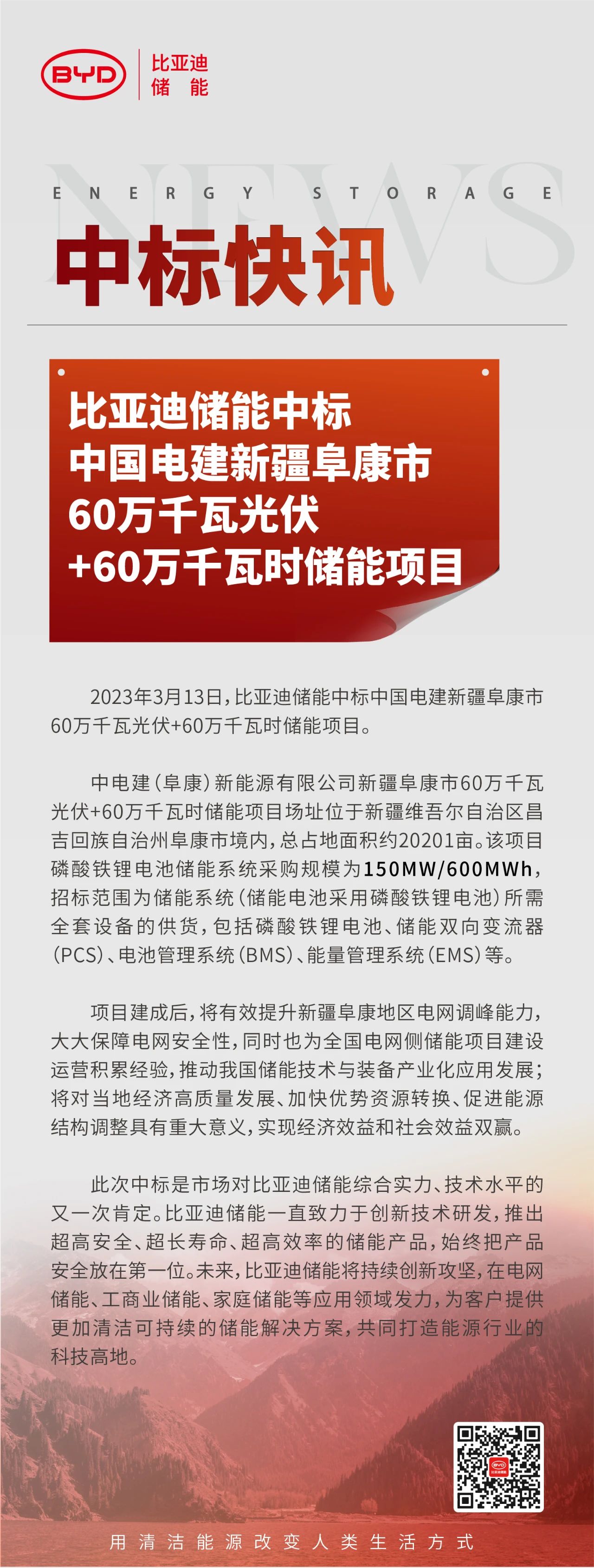 中國粉體網訊 3月13日,比亞迪儲能中標中國電建新疆阜康市60萬千瓦光伏+60萬千瓦時儲能項目。