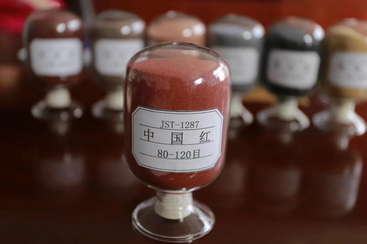 彩色石英砂不僅賦予地坪優美裝飾性能,而且能保障地坪的高抗壓性和高耐磨性。環氧地坪中的彩色石英砂應選用球形顆粒的,并具有合適的級配,彩砂顆粒能夠盡量“最緊密堆積”,使環氧彩砂層充分密實。這樣可以保證產品強度,節省罩面涂層的樹脂用量,降低成本。彩砂地坪中彩色石英砂以人工制備的為主。