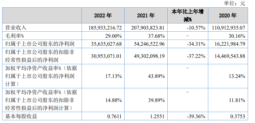 中國粉體網(wǎng)訊 天馬新材于2023年3月17日披露年報,公司2022年實現(xiàn)營業(yè)總收入1.86億元,同比下降10.6%;實現(xiàn)歸母凈利潤3564萬元,同比下降34.3%。