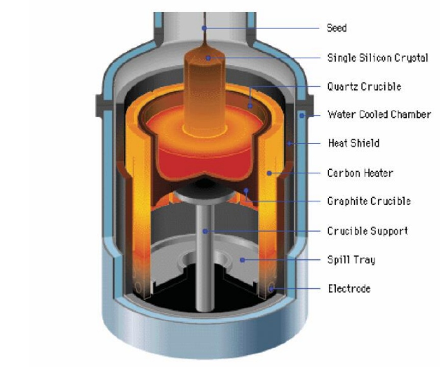 直拉法最初是由荷蘭科學(xué)家Czochralski發(fā)明的,但首先將直拉法用于單晶硅生長(zhǎng)的是Teal和Buehler,他們?cè)?950年使用石英坩堝通過(guò)直拉法生長(zhǎng)出第一根單晶硅。