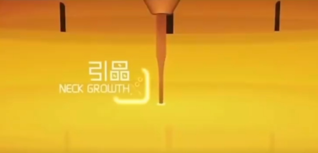引晶完成后,籽晶快速向上提拉,晶體生長(zhǎng)速度加快,新結(jié)晶的單晶硅直徑將比籽晶的直徑小,可以達(dá)到3mm左右,其長(zhǎng)度約為此時(shí)晶體直徑的6~10倍,旋轉(zhuǎn)速率為2~10rpm。縮頸去除了表面機(jī)械損傷的無(wú)位錯(cuò)籽晶。縮頸過(guò)程,直徑越細(xì),位錯(cuò)越少,但直徑過(guò)細(xì),支撐不了晶棒重量,會(huì)發(fā)生掉棒的安全事故。