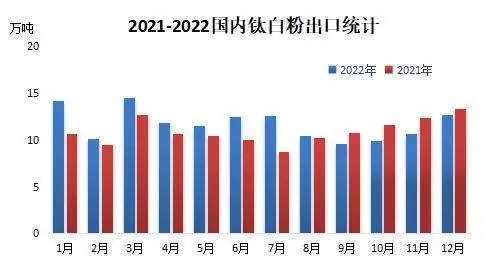 自1999年起,中國每年都有一定量的鈦白粉進口。隨著國內產能的不斷擴張,國內供應過剩加劇,生產企業積極拓展海外市場,鈦白粉行業的出口量近年來保持較快速度增長。2011年以來,我國已從鈦白粉的凈進口國變為凈出口國,出口量較進口量多104.57萬噸。據海關數據顯示,2022年1-12月我國鈦白粉出口量累計140.58萬噸,同比增長7.17%。