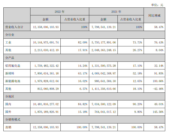 中國粉體網訊 3月22日,多氟多(002407)發布2022年年度報告,報告期內,多氟多總營業收123.58億元,較2021年同比增長58.47%;實現利潤總額22.91億元,歸母凈利潤19.48億元,同比增長54.64%。其中鋁用氟化鹽、新材料及新能源電池三項業務分別占比14.24%、63.17%、16.02%。