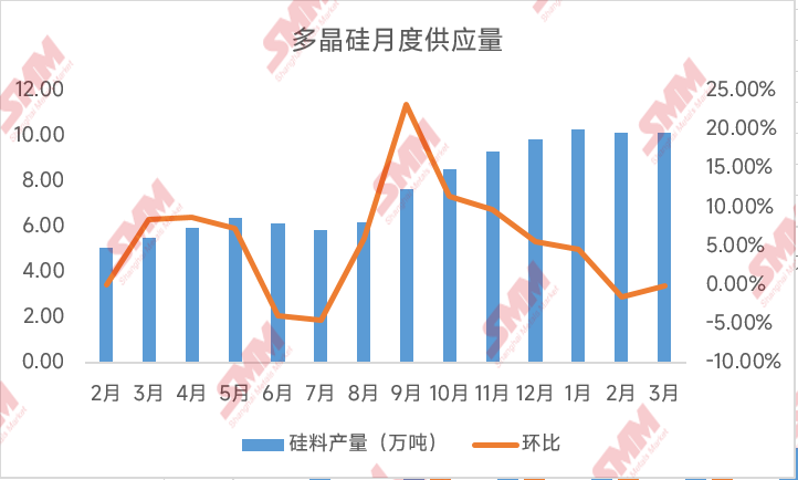 中國粉體網(wǎng)訊 據(jù)SMM數(shù)據(jù)統(tǒng)計,3月國內(nèi)硅料供應(yīng)約為11萬噸,環(huán)比2月顯著上漲8.7%,國內(nèi)多晶硅供應(yīng)在經(jīng)歷2月下滑后,3月供應(yīng)再次重新回到上行通道,上漲原因?yàn)楹危慷径葘⒃鯓樱抗枇鲜袌龉┬枨闆r如何?