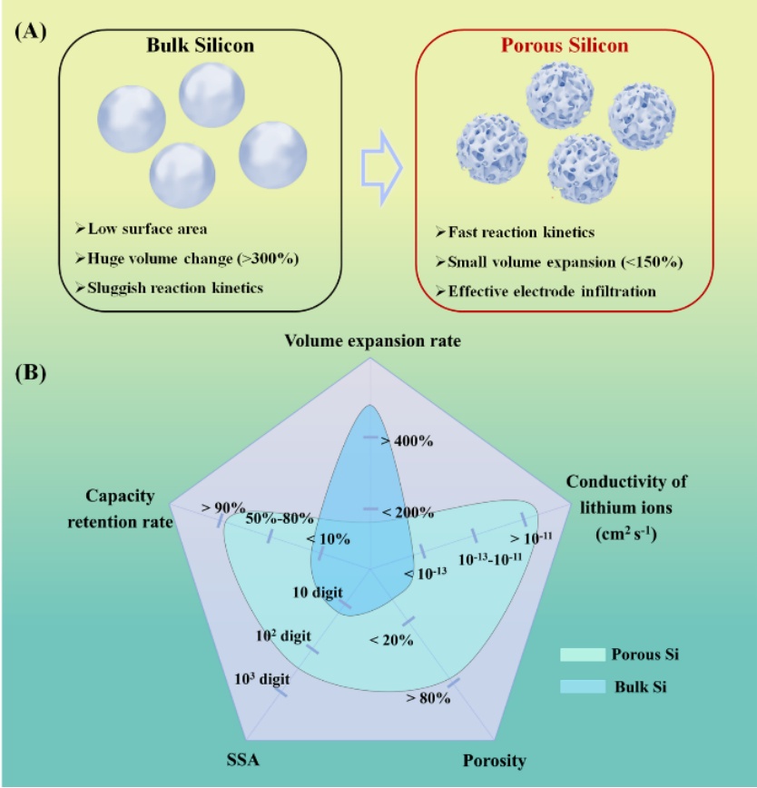 圖1.(a)多孔硅作為鋰離子電池負極材料的結構優勢示意圖,(b)體相硅與多孔硅不同參數的綜合比較。
