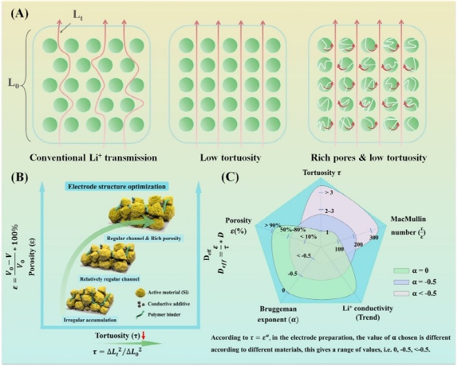 圖2.(A)鋰離子在不同電極結構下的傳輸路徑示意圖,(B)迂曲度、孔隙度與Deff的關系圖,(C)不同Bergmann指數下電極數據的趨勢雷達圖(a)。
