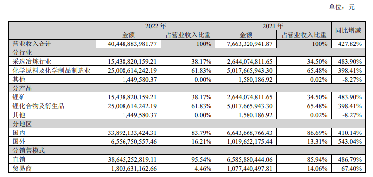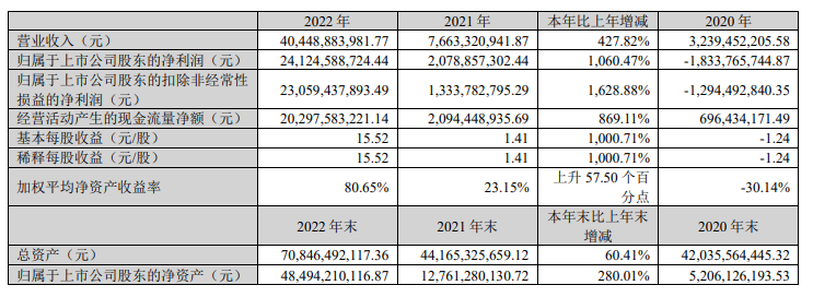 中國粉體網訊 3月30日晚,天齊鋰業(002466)發布2022年年度報告,報告期內,天齊鋰業實現營業總收入404.49億元,同比增長427.82%;歸屬于上市公司股東的凈利潤為241.25億元,同比增長1060.47%,扣除非經常性損益后的凈利潤為230.59億元,同比增長1628.88%。