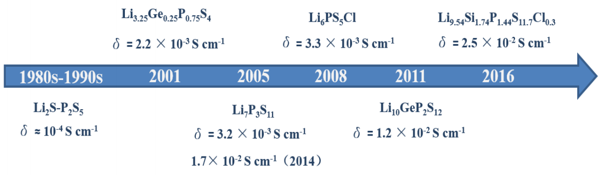 1980s-1990s,以Li2S·P2S5為代表的玻璃態硫化物固態電解質被開發出來;隨后第一個晶態的硫化物固體電解質Li3.25Ge0.25P0.7S4在2001年被東京工業大學的學者發現;2005年,大阪府立大學的學者合成了玻璃陶瓷電解質Li7P3S11;2008年德國錫根大學的學者發現了硫銀鍺礦型的Li6PS5X(X=Cl、Br、I);2011年東京工業大學的學者合成出Li10GeP2S12。