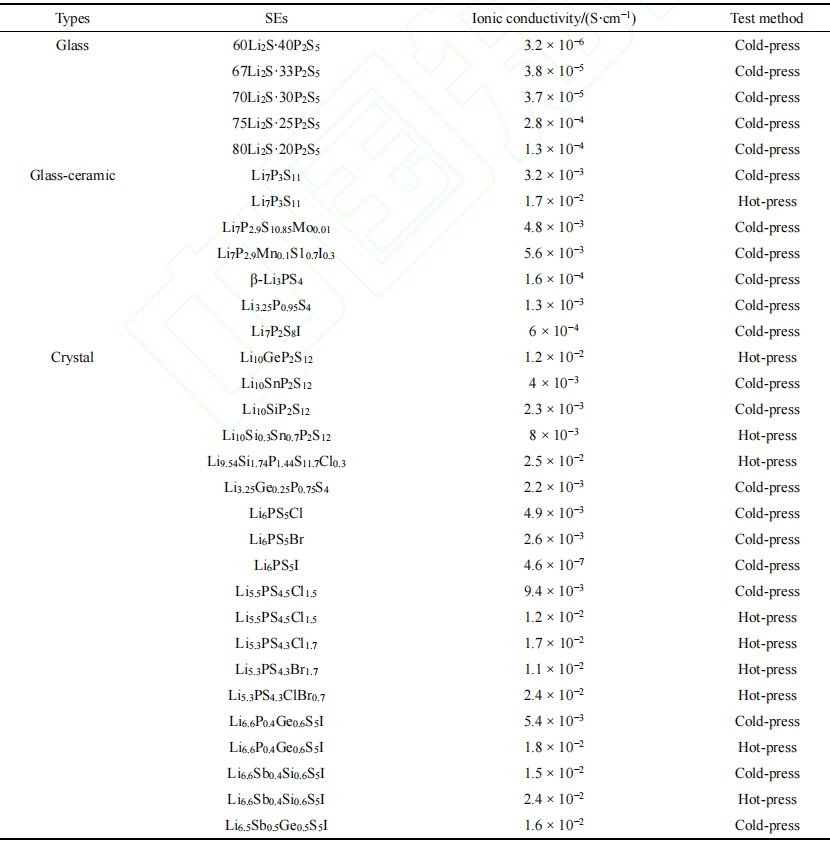 硫化物固態電解質按照組成主要可以分為兩類,一類是二元硫化物電解質由Li2S和P2S5組成,比如Li3PS4和Li7P3S11;一類是三元硫化物固態電解質由Li2S、P2S5和MS2(M=Si、Ge、Sn),如Li10GeP2S12和Li6PS5X(X=Cl、Br和I)。根據晶體結構,硫化物固態電解質可以被分為為玻璃態、玻璃陶瓷態和晶態。