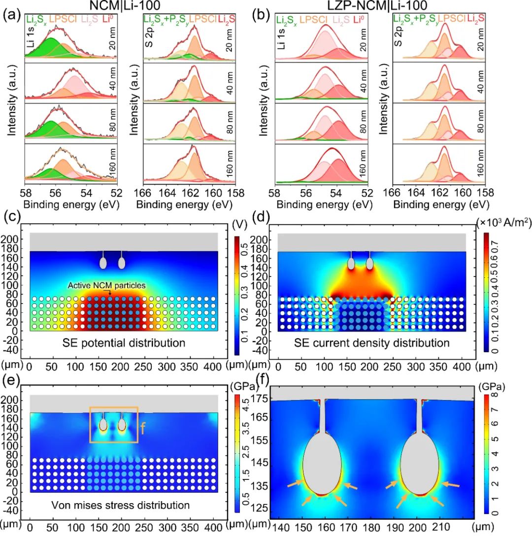 深度刻蝕XPS結果表明改性后的正極可明顯抑制在循環過程中負極表面有害副產物的產生。上述模擬結果顯示并驗證了正極局域失活和局部電解質內鋰沉積均會導致鋰離子流在活性區域的集中化,引起正負極反應異質性。
