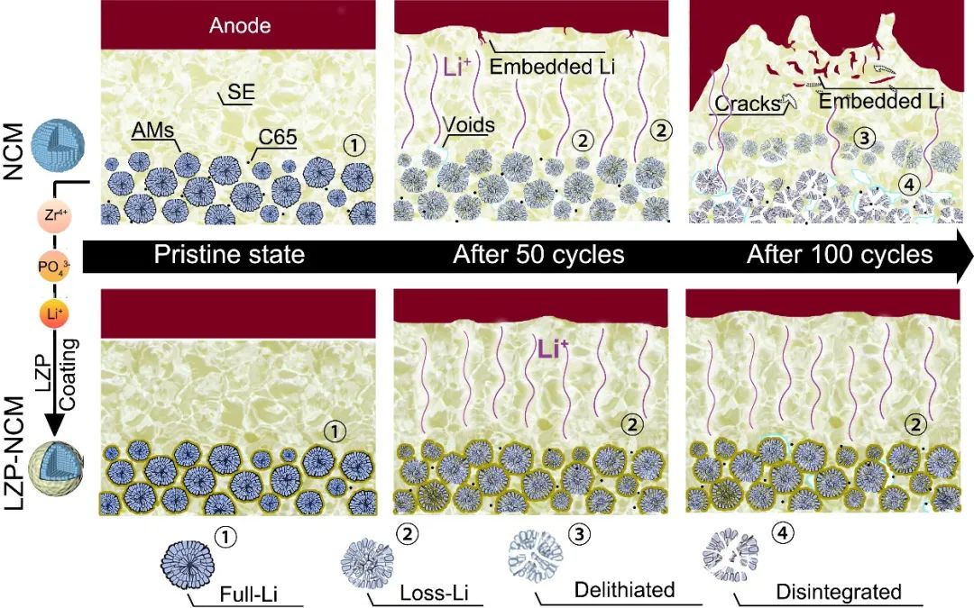 示意圖顯示:電池循環過程中,正極電化學-機械力學失效(顆粒破裂并與電解質脫離)引發反應異質性并通過不均勻的鋰離子通量傳輸到負極,造成不均勻的鋰沉積、溶解行為及電解質中死鋰的產生等。鋰負極不均勻的電化學反應行為能夠反作用于正極并強化其反應異質性,造成正負極間衰退的互相促進。采用LiZr2(PO4)3(LZP)對正極進行改性,不僅有效抑制了正極的電化學-機械力學耦合失效,而且顯著提高了負極鋰沉積-溶解均勻性和電解質的結構完整性。