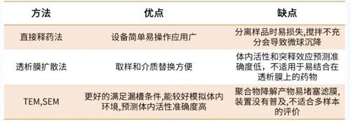 ③ 透析膜擴散法,該法是指將微球放入透析管中,并將其放入介質中測定。3種方法優缺點比較見表1。