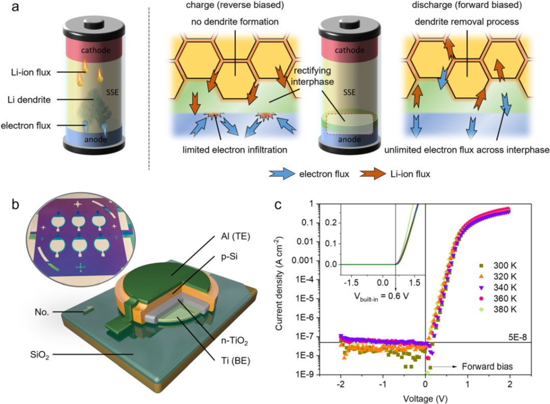 圖1(a)左部分描述了在傳統固態電解質中鋰枝晶形成的機理,右部分描述了整流界面分別在電池充電和放電過程中的作用。(b)用于驗證整流界面作用的芯片器件,以及(c)對應的I-V曲線。