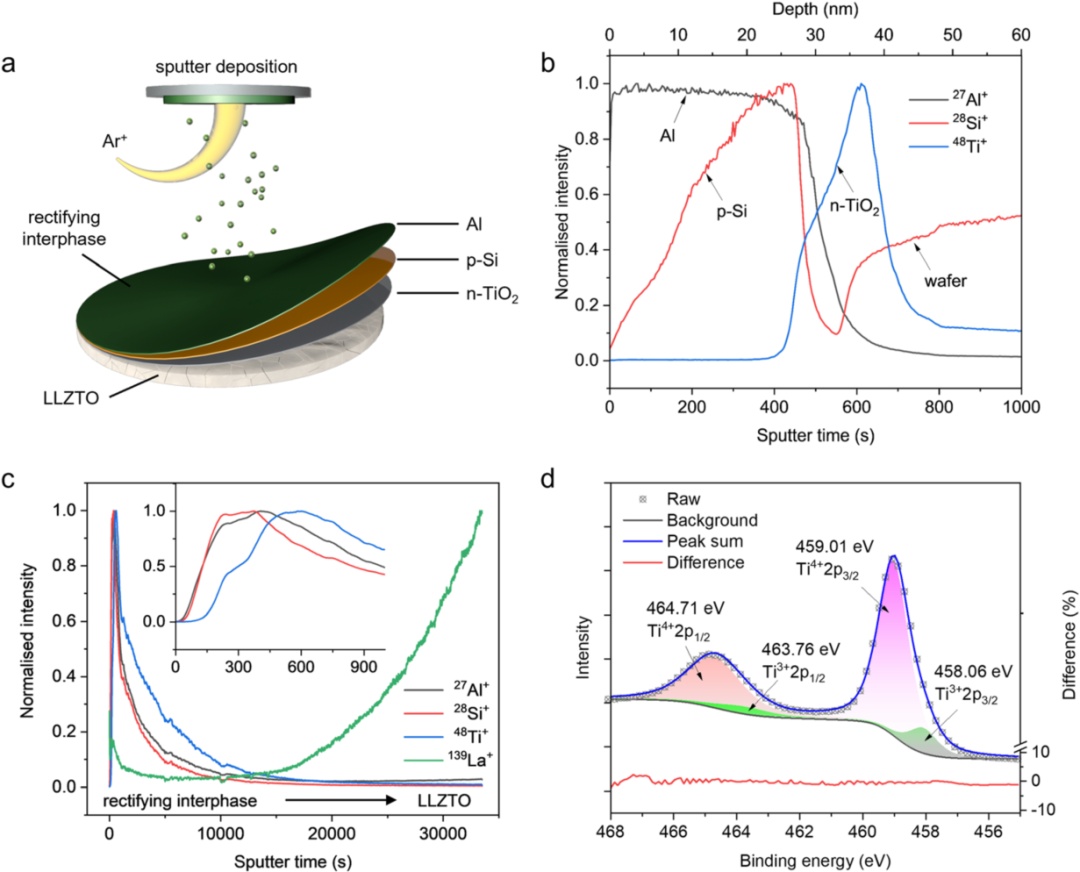 圖2(a)在LLZTO固態電解質表面蒸鍍整流界面的示意圖。(b-c)用于表征蒸鍍后表面化學成分的ToF-SIMS元素分布深度剖析。(d)高分辨TiO22p能級的XPS圖譜以及擬合曲線。