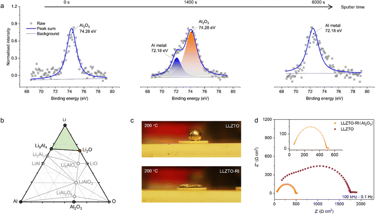 圖4外層Al元素2p能級的XPS深度剖析。(b)Li-Al-O三元系統相圖。(c)LLZTO和LLZTO-RI對于鋰金屬的浸潤性測試。(d)通過鋰對稱式電池測量的界面電化學阻抗譜。