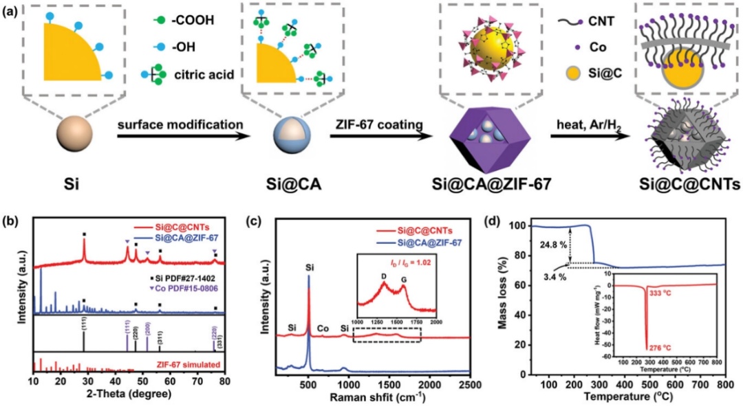 基于此,來自合肥工業大學的張衛新教授和范小明副教授在國際知名期刊Small上發表題為“Carbon Nanotube-Reinforced Dual Carbon Stress-Buffering for Highly Stable Silicon Anode Material in Lithium-Ion Battery”的研究論文。該研究利用檸檬酸誘導金屬有機框架(MOFs)原位均勻包覆硅納米顆粒,經熱處理后成功制備具有碳納米管增強的雙碳應力緩沖層的硅碳負極材料,將其應用于鋰離子電池電極材料展示出優異的長循環穩定性和倍率性能。