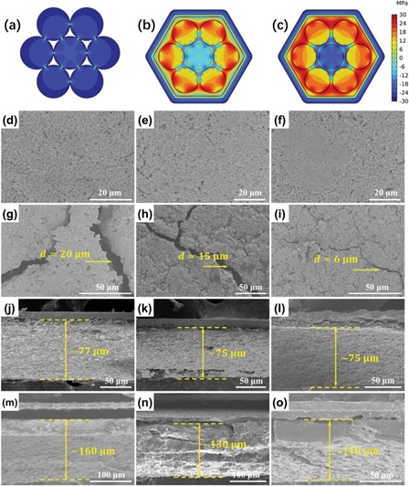 圖3(a)Si@C,(b)Si@C@C,(c)Si@C@CNTs在完全鋰化后的應力分布圖;循環前電極(d-f)和循環后電極(g-i)的正面視圖;循環前電極(j-l)和循環后電極(m-o)的側面視圖。左、中、右三列的SEM圖分別為Si@C、Si@C@C和Si@C@CNTs。
