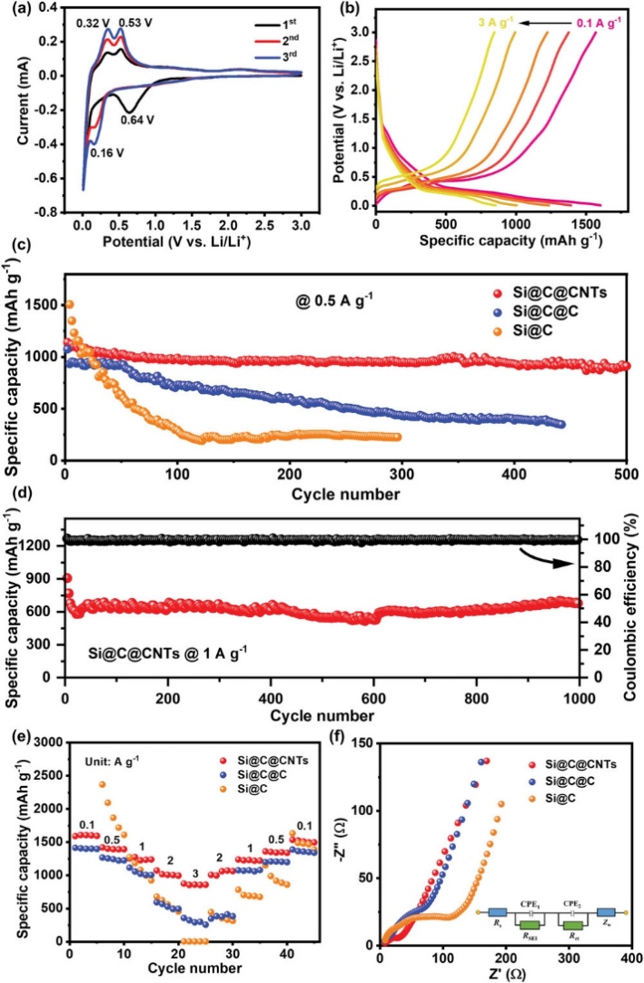 圖4Si@C@CNTs負極材料的電化學性能:(a)Si@C@CNTs的CV曲線;(b)Si@C@CNTs的充放電曲線圖;(c)Si@C@CNTs、Si@C@C和Si@C在0.5Ag-1下的循環性能。d)Si@C@CNTs在1Ag-1下的循環性能和庫侖效率。