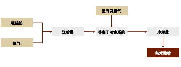 PECVD法的優點在于制備的硅粉尺寸可以達到50nm以下,顆粒尺寸穩定性好,反應基本溫度低,沉積速率快,已經實現量產。但這種方法也存在很大缺點:首先,原料SiH4是易燃易爆氣體,運輸和生產過程中存在很大安全隱患;其次,規模生產設備投資大、成本高,生產過程中伴隨強輻射、溢出的金屬蒸汽粉塵等對人體有害,產生的有害廢氣難以處理。